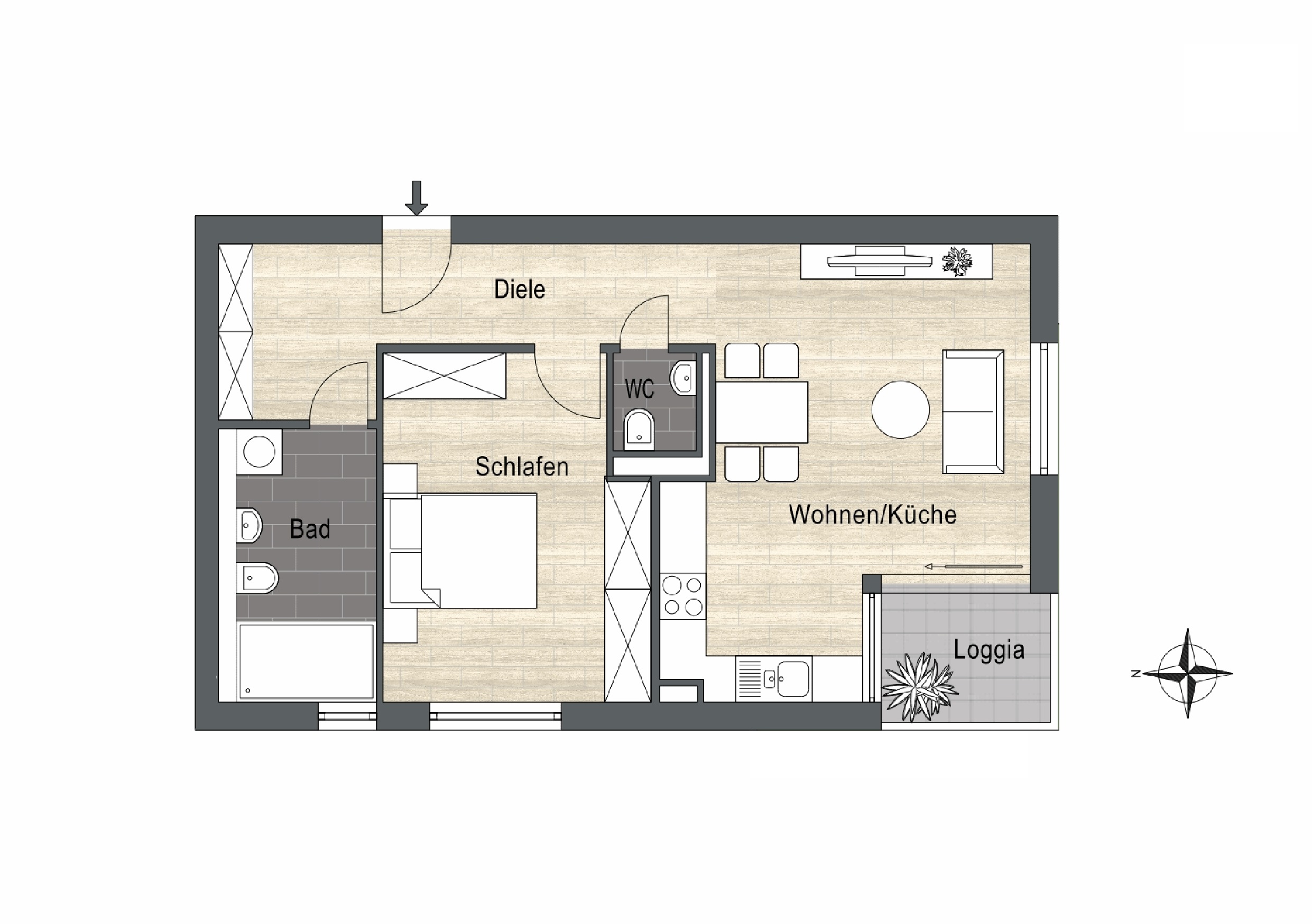 Der offen gestaltete Wohnbereich mit Küche bietet eine angenehme Raumwirkung und vielfältige Nutzungsmöglichkeiten. Der Schlafraum ist klar getrennt angeordnet und sorgt für Rückzug. Die Loggia ergänzt den Wohnraum und schafft zusätzlichen Freiraum.